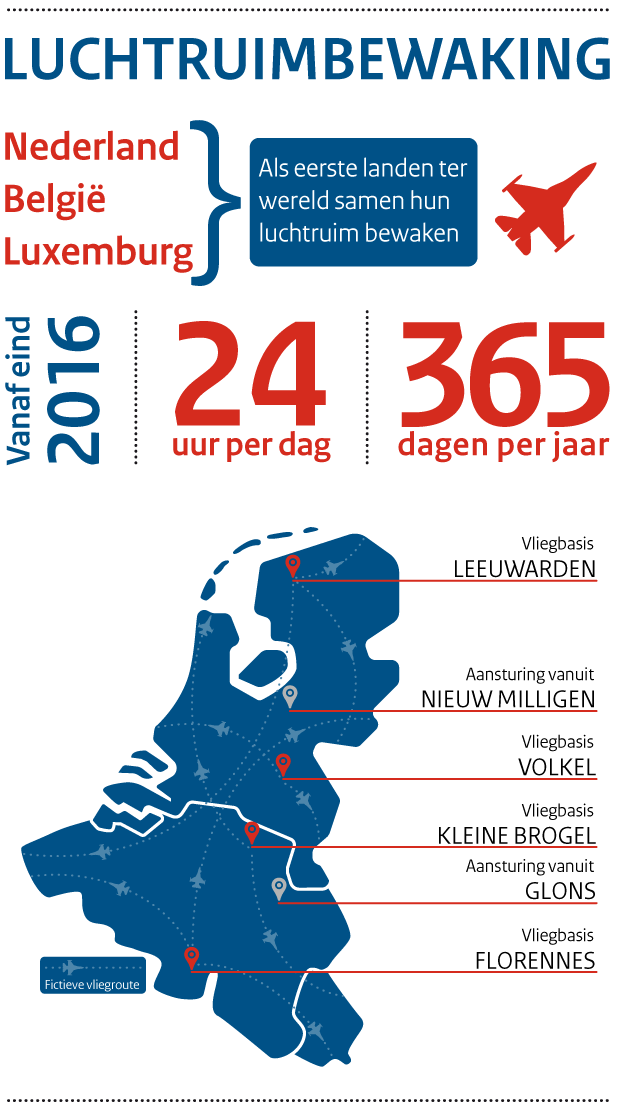 België, Nederland en Luxemburg gaan samen het luchtruim van de Benelux bewaken. Nederland en haar zuiderbuur stellen daarvoor allebei 2 F-16’s beschikbaar. Vanaf eind 2016 opereren ze bij toerbeurt vanaf verschillende vliegbases.