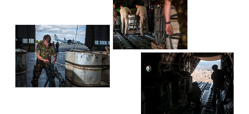 Vier CDS-ladingen staan klaar bij de Nederlandse C-130. Bart inspecteert de zogeheten ‘rigging’ nog voor ze in het laadruim verdwijnen. Alle touwen en banden worden bekeken, bevoeld. “In de lucht komen hier straks zulke grote krachten op te staan, dat zelfs een klein haakje in een spanband ervoor kan zorgen dat ‘ie knapt,” vertelt de adjudant. Als de ladingen eenmaal aan boord zijn verankerd, lopen Bart en collega-senior loadmaster Marcel samen alles nogmaals na. Bart: “Een airdrop-inspecteur vliegt nooit zijn eigen missie. Net als bij de slager: die keurt ook niet zijn eigen vlees.”