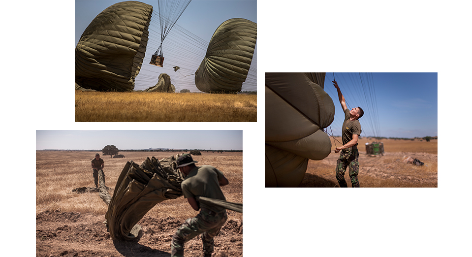 Groene rook: groen licht. Laag en traag komt de C-130 over. 130 knopen bij een hoogte van 600 voet. 240 kilometer per uur, op minder dan 200 meter hoogte. Darryls collega majoor Marcel trekt de neus van de Hercules iets omhoog. ‘Loadie’ Marcel snijdt de spanband door. Eén voor één glijden de ladingen naar buiten. Parachutes ploppen open. Al komt 1600 kilo dan nog heel snel naar de grond. DOEF! DOEF! DOEF! DOEF! Aan het ritme van de dreunen hoort pathfinder Sanch al dat het een goede drop is. Oftewel: vloeiend uit de kist en allemaal binnen 100 meter van het markeringspunt. De C-130 cirkelt terug, want ook de bemanning is benieuwd naar de score. Vleugelwiegend dankt de Hercules de Portugese collega’s op de grond: obrigado!