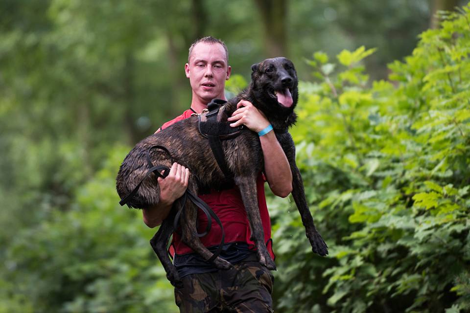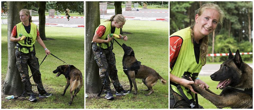 Op de achtergrond klinkt een schreeuw. “Tarak, los!” Als korporaal Charmaine van der Linde na de bijtoefening gesloopt de finish passeert, neemt Jan Willem hond Tarak direct over. Leunend tegen een boom komt Charmaine puffend en steunend op adem. En Tarak? Die krijgt 3 stevige kloppen op de schouder. “Jij bent de beste.”