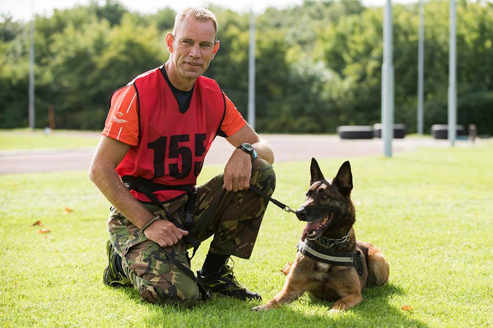 Sergeant-majoor Jan Willem Jonk (Hoofd Honden en Kennelsectie vliegbasis Gilze-Rijen) voor de race samen met Rex.