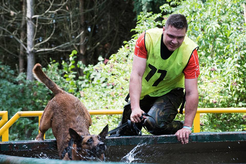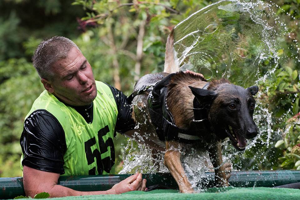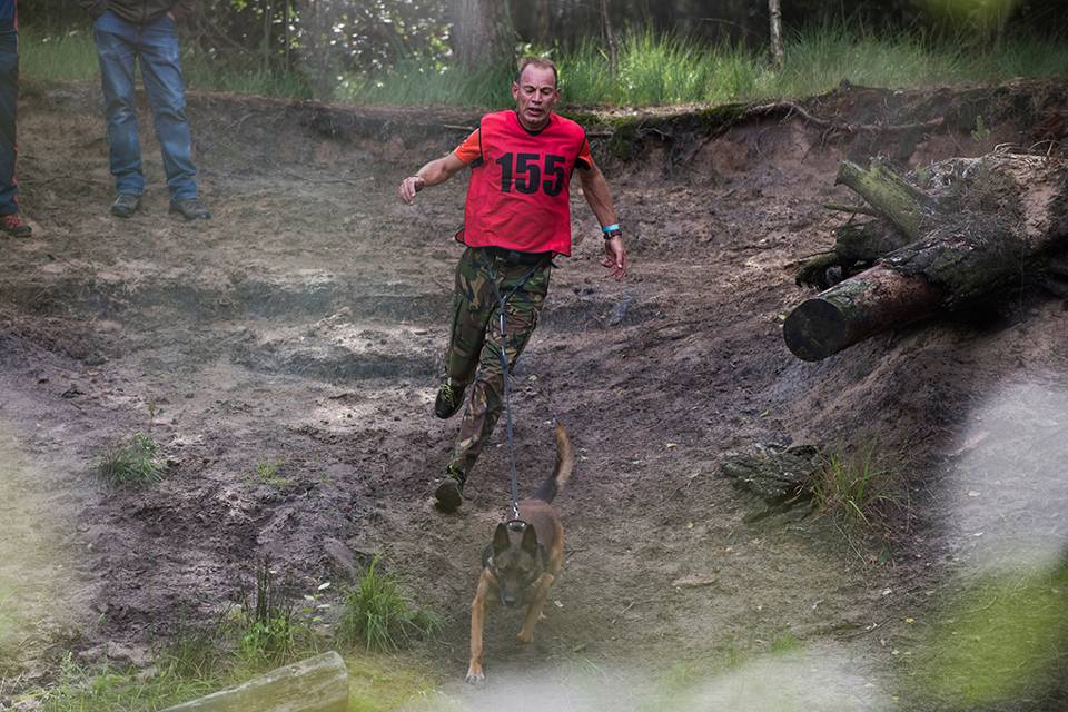 Het parcours is divers. Moet de baas zijn hond een kleine 20 meter dragen, verderop bedwingen de teams hindernissen als muurtjes, auto’s en autobanden. Een schietproef, waarbij iedere misser een extra rondje lopen kost, wordt gevolgd door een aantal meters ploeteren door een modderig geultje.