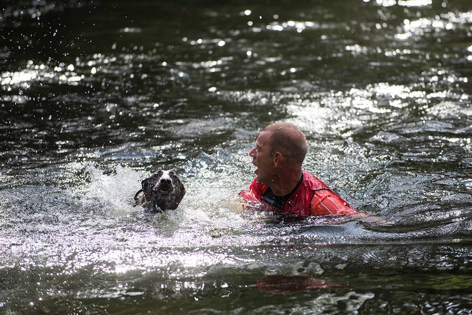 Het duo Jan Willem en Rex zwemt naar de overkant.