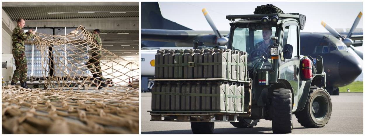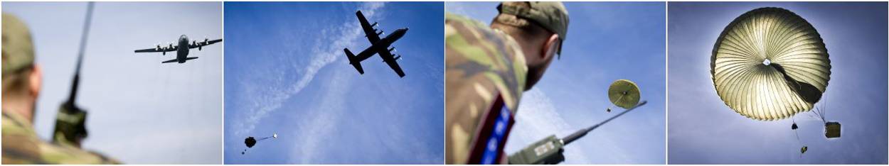 Dit keer levert de C-130 in 4 keer vracht af die essentieel kan zijn als de Luchtmobiele Brigade acties uitvoert in de voorste linies. Wat gebeurt er bijvoorbeeld met een pallet beladen met 648 liter water in plastic flessen als je die van 200 meter hoogte met een parachute laat landen? Of een kist met een zogenoemde Rapid Airway Repair Set van de genie. Dat is essentieel materieel om een landingsbaan provisorisch te kunnen repareren. “Die spullen hebben afwijkende vormen. Denk maar aan een paar kruiwagens en een kleine shovel”, legt sergeant 1 Albert uit.