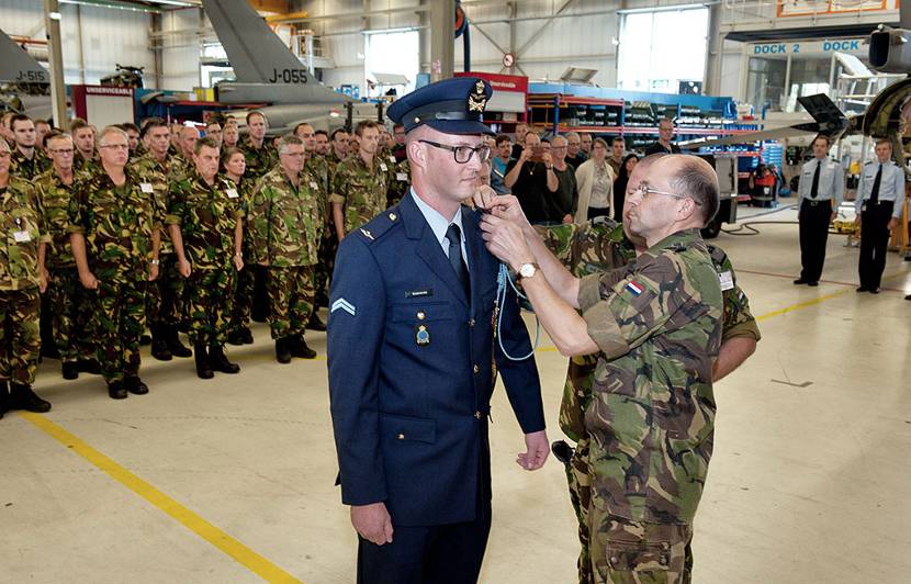 Voor het redden van een 89-jarige man uit een brandende auto, kreeg korporaal Walter Bloemendal op 1 oktober het Erekoord uitgereikt. Terwijl de luchtmachter die werkt bij het 980 Squadron op 25 september door Lunteren reed, raakte een andere chauffeur van de weg. Door het ongeval scheurde de benzinetank en vatte de auto vlam. Zonder een moment te aarzelen, rende Bloemendal naar de auto, forceerde de deur en bracht de bejaarde man in veiligheid. De onderscheiding die Bloemendal dit kordate en heldhaftige optreden kreeg, mag hij op het uniform dragen. Foto: Jan Schram / Beeldnet