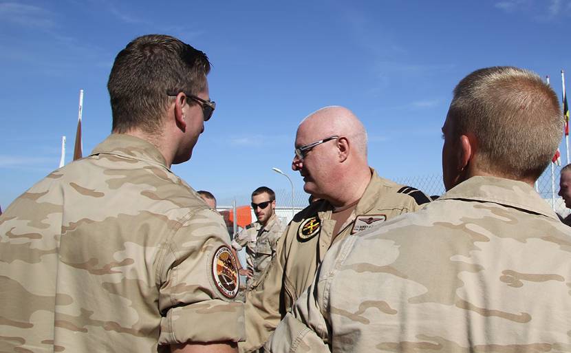 Tevens sprak de generaal met Belgische detachementsleden, In de Force Protection-rol verantwoordelijk voor de bescherming van de Air Task Force. 1 van hen, adjudant-chef Pascal, kreeg een tevredenheidsbetuiging vanwege zijn bijdrage aan de goede integratie en samenwerking tussen de Nederlanders en de Belgen. Sinds juli maken onze zuiderburen deel uit van het Nederlandse detachement. Kijk voor meer over de ATF elders in dit blad. Foto: ATF ME