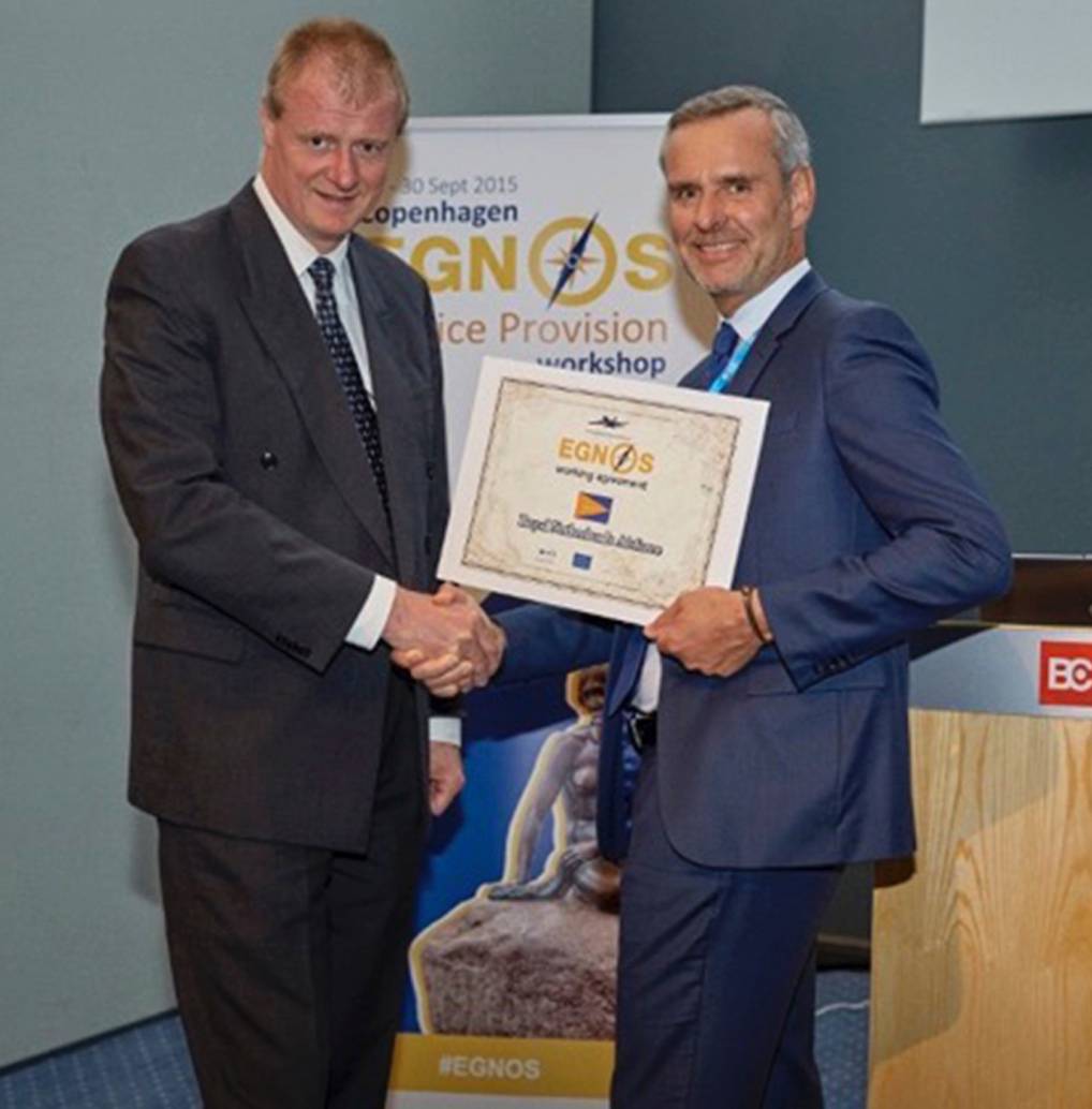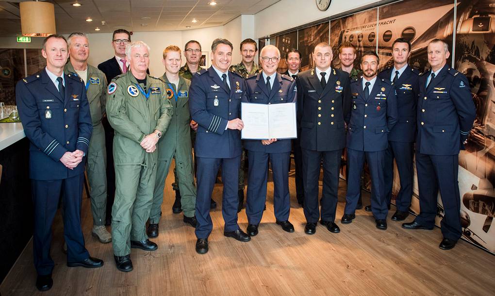 Tijdens de meeting nam KLu-vertegenwoordiger majoor Waldo Jacobsen een certificaat in ontvangst dat de luchtmacht de bevoegdheid geeft om deze service te verlenen. Het eerste vliegveld waar deze naderingen uitgevoerd mogen worden is vliegveld Teuge. Foto: Egnos