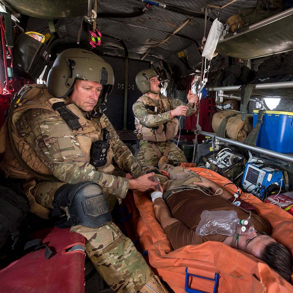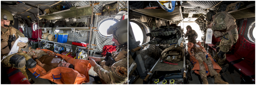 Om medisch van betekenis te zijn, is een snelle reactietijd pure noodzaak. En daarvoor is de Chinook bij uitstek het middel. Uiteraard inclusief flight crew. Het vliegend personeel houdt zich bezig met de vlucht en beveiliging, de hulpverleners zijn er voor de mens in medische nood. “Tijdens de heenvlucht leggen we alles in de heli gereed”, vertelt flight nurse sergeant 1 Jack. Pijnstillers, infusen en allerlei andere hulpmiddelen liggen klaar voor gebruik, zodat de medevacs bij aankomst direct aan de slag kunnen. “Want,” zegt Jack, “tijd is kostbaar in dit soort situaties.”