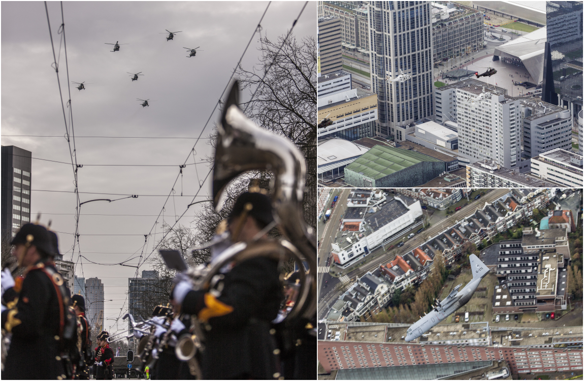 Het defilé eindigde met het overvliegen van 2 Cougars en evenzoveel NH90’s van het Defensie Helikoptercommando, aangevuld met 2 Sea King Commando’s van de Royal Marines. Een C-130 van het 336 Squadron sloot het luchtdefilé af. Foto: sergeant Hille Hillinga. Luchtfoto’s Marco Ferrageau.