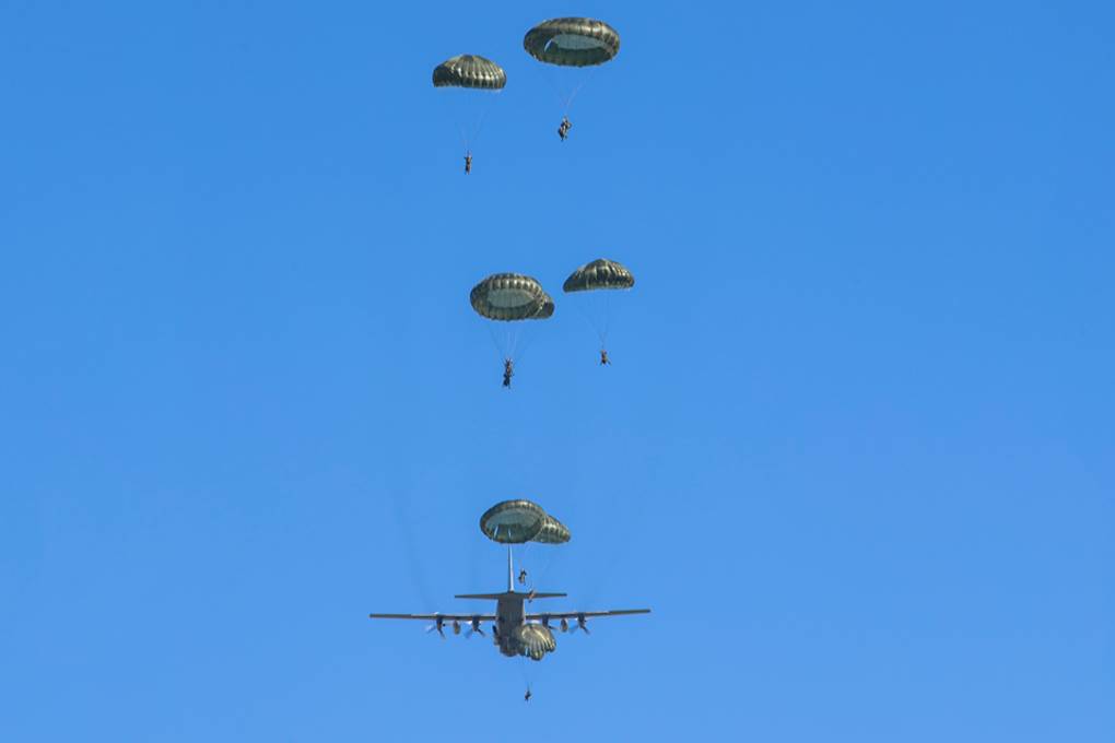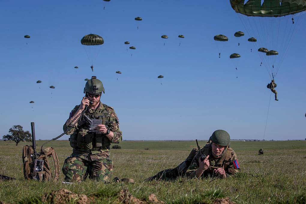 Zo’n 200 meter lager staart korporaal 1 Devin naar de neerdwarrelende mannen en pakketten. De pathfinder van 11 Luchtmobiele Brigade heeft er samen met zijn 4 collega’s voor gezorgd dat de dropzone is gemarkeerd en wordt beveiligd. Met hun radio’s loodsen ze vliegtuigen naar het doelgebied. Devin: “We houden constant contact. Veranderingen in bijvoorbeeld hoogte, snelheid en windrichting geven we door zodat we precies kunnen timen wanneer moet worden gesprongen of gelost.”