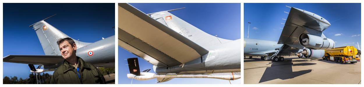 Adjudant Stephane is Flight Engineer en boomer op de Stratotanker van de Armee de l'Air, bouwjaar 1962. “De tankboom stuur ik – liggend op mijn buik – vanuit een kleine ruimte onder de romp. Het probe-and-droge-systeem (met tankslang vanuit een gondel onder de vleugeltip, red.) bedien ik vanuit de cockpit. Daarvoor moet ik een kwartslag draaien zodat ik op 2 monitors kan zien wat er aan iedere vleugel gebeurt. Sturen kun je die slangen niet. Het is aan de vlieger om zijn probe in onze drogue te mikken.”