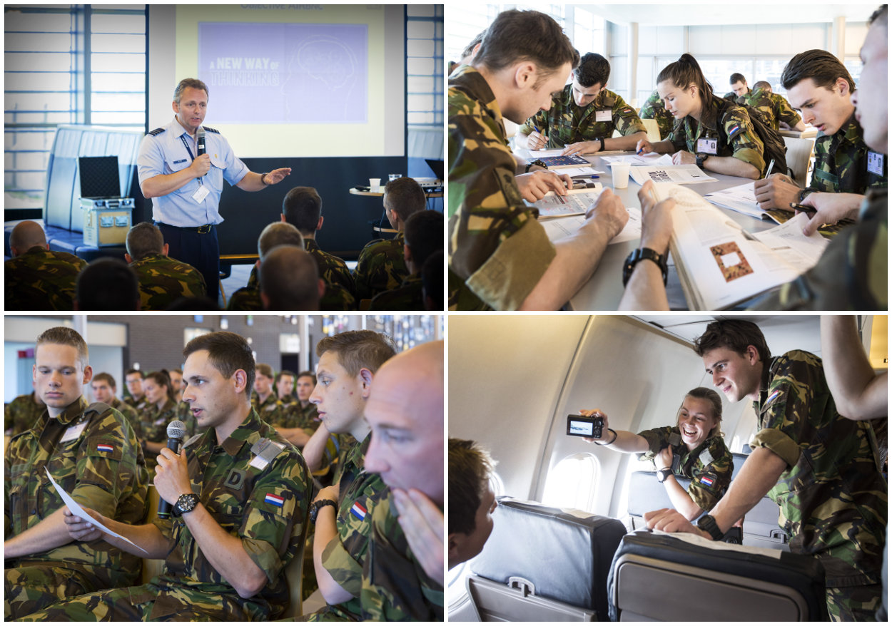 Bijna 70 leerlingen van de Koninklijke Militaire School Luchtmacht werden door gastsprekers bijgepraat over onder meer CLSK 3.0 en de KLu van de toekomst. De workshop Foresight dwong de deelnemers na te denken over allerlei toegepaste technieken, waarmee het ‘krijgsmachtdeel van morgen’ zijn voordeel kan doen. Het programma voorzag ook in meevliegen met een KDC-10 tijdens een tankermissie. Foto’s: Louis Meulstee