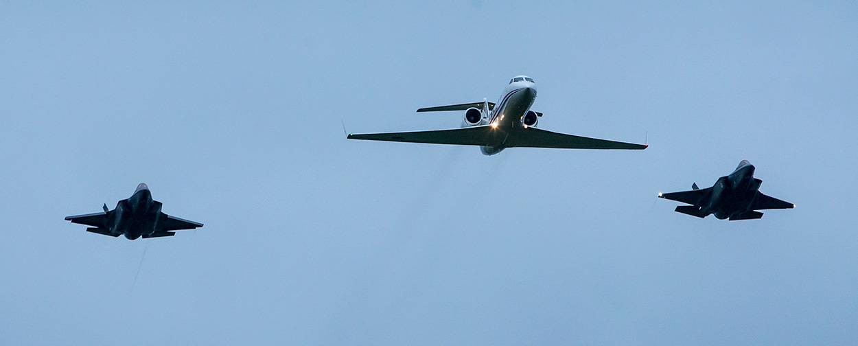 Niet veel later scheert de Gulfstream met aan weerszijden een F-35 laag over de vliegbasis. Uit de motoren van de Lightnings klinkt een diep, bijna grommend geluid. Heel anders dan van de F-16, die een veel scheller geluid produceert.