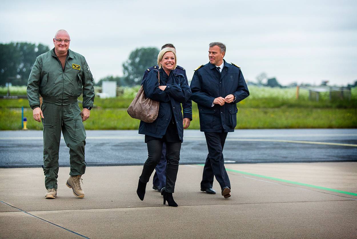 Luitenant-generaal Sander Schnitger, minister van Defensie Jeanine Hennis-Plasschaert en Plaatsvervangend Commandant der Strijdkrachten vice-admiraal Rob Bauer (v.l.n.r.) zijn overduidelijk blij met de komst van de F-35.