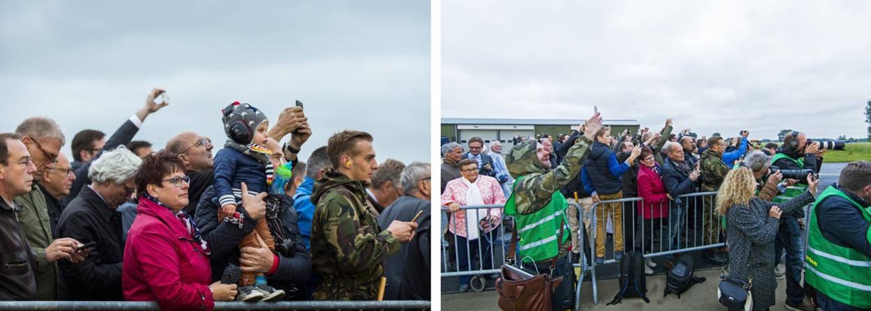 Op de vliegbasis wacht een welkomstcomité van honderden familieleden, luchtmachtpersoneel en journalisten op de opvolger van de F-16. De wind maakt het guur en mensen duiken weg in hun kraag. Fennie en Herman Timmer willen deze primeur niet missen. “Dit is voor ons heel speciaal”, vertelt Fennie. Hun zoon is de eerste die de F-35 heeft gevlogen en ook de 2 vliegers heeft opgeleid die de toestellen nu naar Nederland vliegen. “We hebben het proces vanaf het begin meegemaakt. Dan is het heel bijzonder dat dit toestel voor eerst op Nederlandse bodem is.”