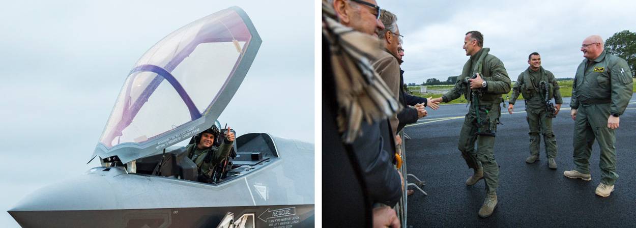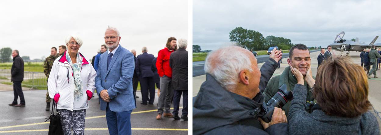 Foto links: Zoon van Fennie en Herman is Laurens Jan Vijge. Hij was op 18 december 2013 de eerste Nederlandse vlieger die met een F-35 vloog. | Foto rechts: F-35-vlieger Pascal Smaal wordt na een urenlange vlucht over de Atlantische Oceaan verwelkomd door zijn schoonouders.