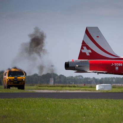 Nog voor de Luchtmachtdagen van start gaan, staan alle hulpdiensten al op scherp. Zeker op donderdag wanneer alle deelnemers aan de vliegshow hun rehearsal vliegen. Daarbij controleren de Display Directors en het Display Safety Team of de demonstratie volgens het opgegeven vliegplan en dus veilig verloopt. Dat gaat precies volgens planning, totdat er zand in de machine van Patrouille Suisse komt. Twee toestellen komen met elkaar in aanraking; 1 landt met een beschadigd hoogteroer veilig op Leeuwarden. Het andere toestel crasht in Bitgum. Even daarvoor heeft de vlieger zich met zijn schietstoel in veiligheid gebracht, maar loopt bij de landing in een kas verwondingen aan zijn benen op. De volgende dag is hij al weer op de vliegbasis.