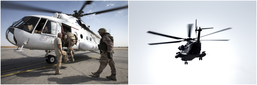 Voor de perfecte situational awareness vliegt Michielsen – per Mi-17, foto links – over de regio waarin missie Resolute Support opereert. Ook de Duitse CH-53 Stallion (r.) vliegt voor de NAVO-troepen.