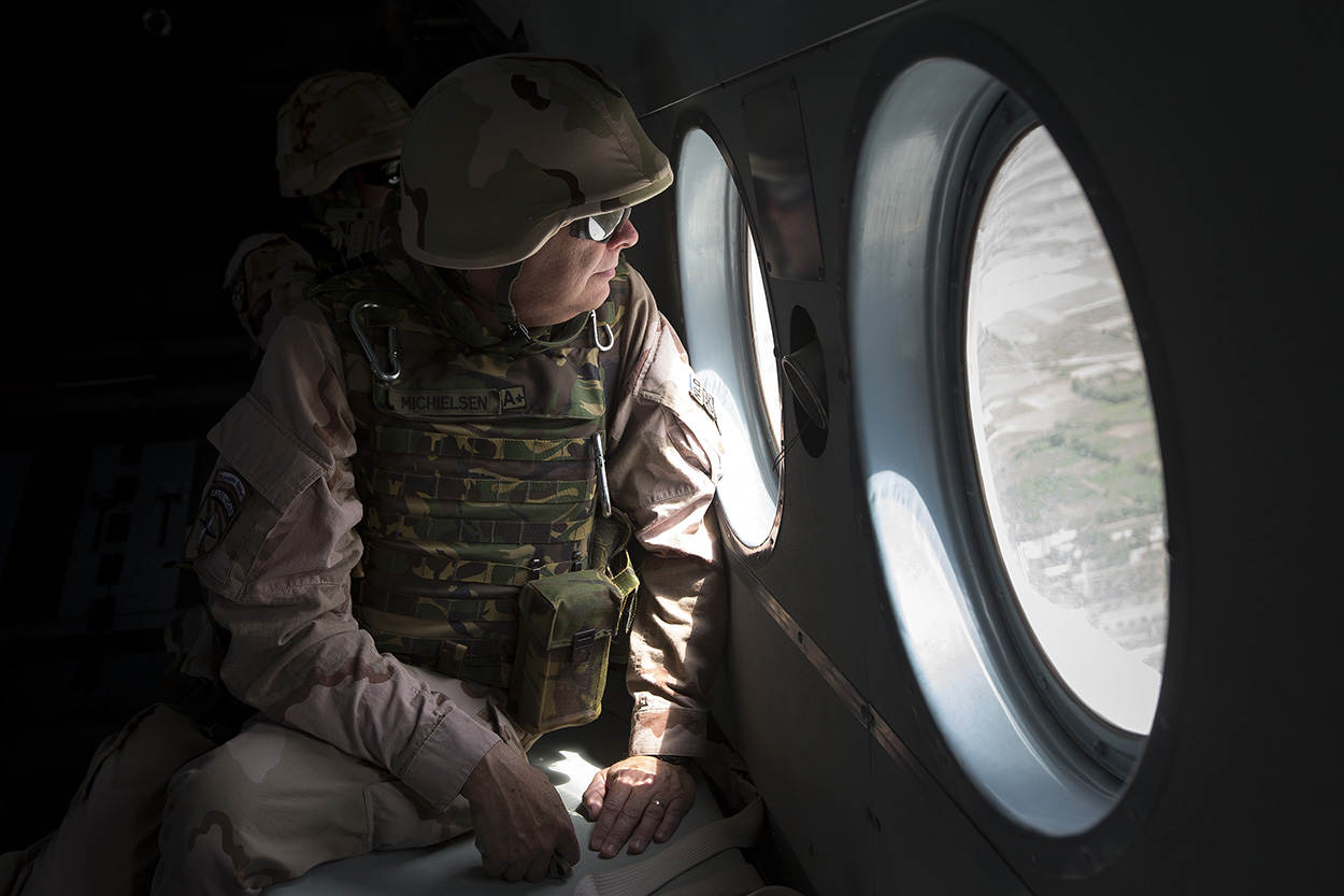 Kolonel Michielsen per Mi-17 onderweg boven Afghanistan. Als CJ4 valt hij onder het hoofdkwartier van het Train Advise Assist Command-North.