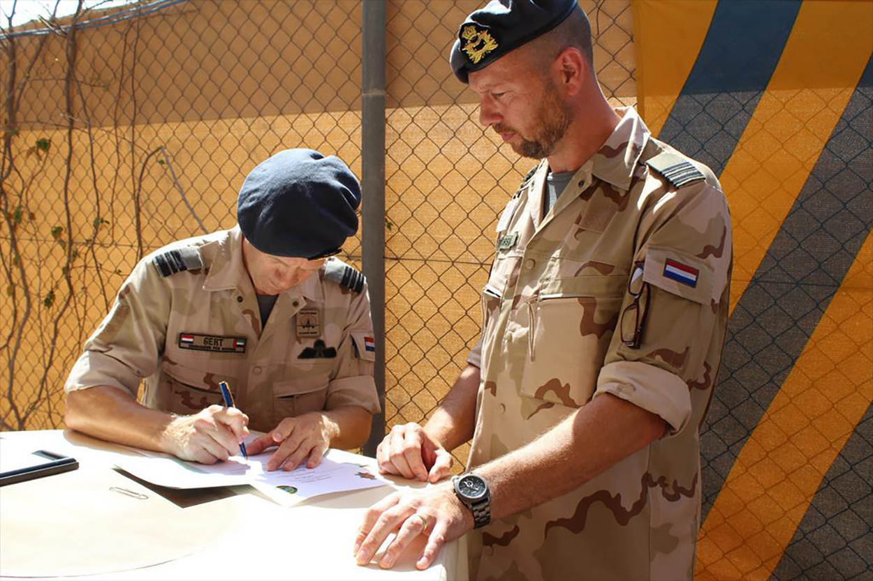 Zij kregen de medaille uit handen van Commandant der Strijdkrachten (CDS) generaal Tom Middendorp. Hij stelde dat de missie in Mali gevaarlijk is. Er werd een aanslag gepleegd op het kamp in Kidal. Door een ontploffende mortiergranaat kwamen collega’s Kevin Roggeveld en Henry Hoving om het leven en raakte een collega zwaar gewond. “Ondanks de moeilijke momenten, de frustratie over de stroperigheid van de VN, de dreiging en de trieste herinneringen, hebben jullie met z’n allen in Mali uitstekend werk verricht.” De CDS gaf aan regelmatig complimenten van coalitiegenoten te krijgen over het werk van de Nederlandse militairen. “Dat is iets waar we als krijgsmacht trots op mogen zijn.” Foto’s: Defensie