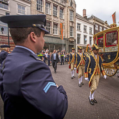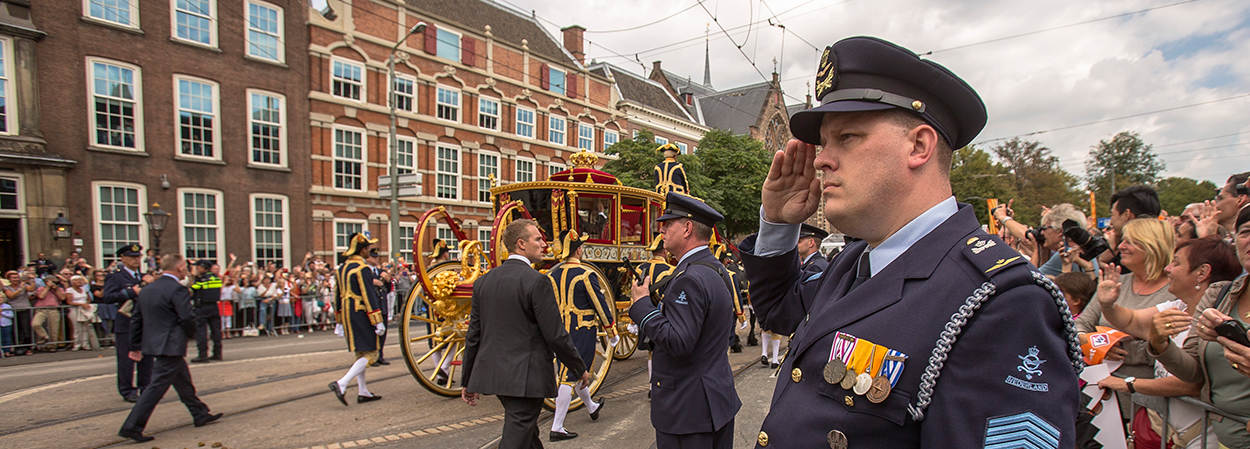 De militaire muziek laat flink zich horen op deze eerste dag van het parlementaire jaar. Als de koning en koningin paleis Noordeinde verlaten, speelt de Kapel van de Koninklijke Luchtmacht het Wilhelmus.