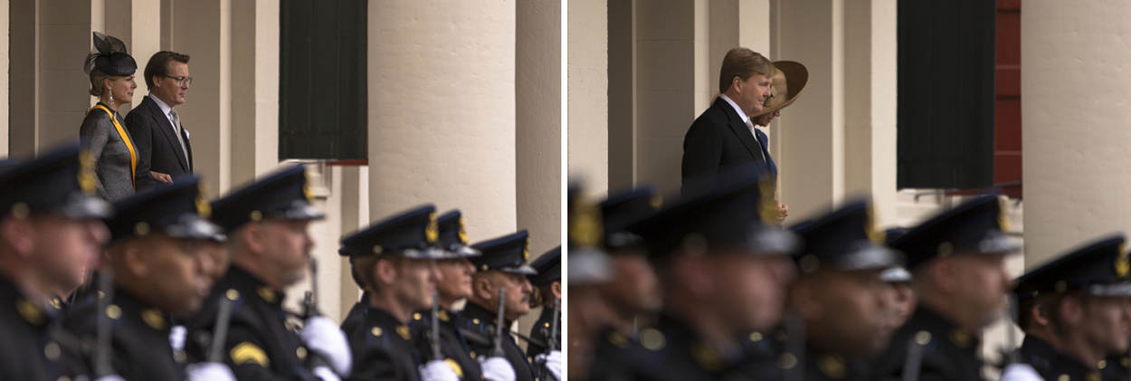 Links vertrek van prins Constantijn en prinses Laurentien, rechts koning Willem-Alexander en prinses Máxima.