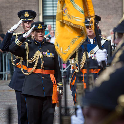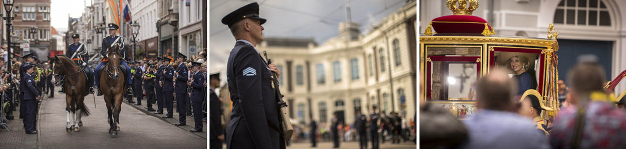 De Gouverneur der Residentie, Commandant Koninklijke Marechaussee luitenant-generaal Harry van den Brink, gaat de Koninklijke stoet vooruit om de troepen te langs de route te inspecteren. Koning Willem-Alexander en koningin Máxima (foto r.) zaten dit jaar voor het eerst in de Glazen Koets.