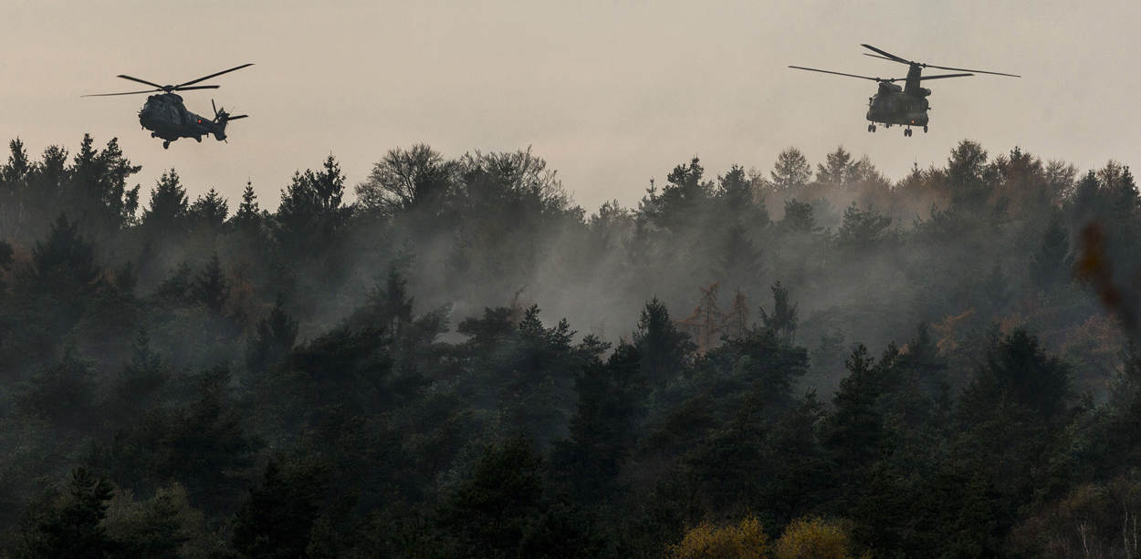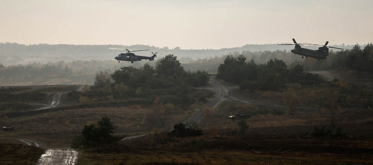 Een Chinook en een Cougar verkennen het oefenterrein Bergen Hohne.