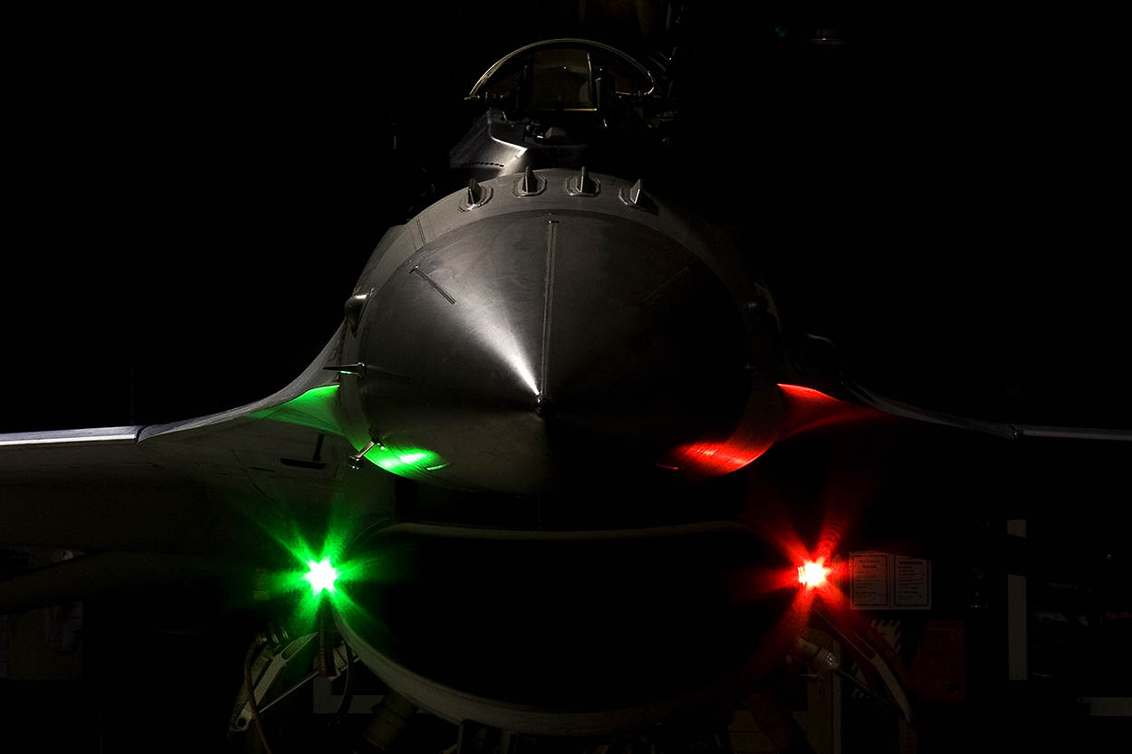 In uitzendgebieden vindt inzet van F-16’s rond de klok plaats. Het toestel is goed uitgerust voor nachtelijke operaties. Voor nachtelijke operaties gebruiken de vliegers nachtkijkers, ofwel helderheidsversterkers. Foto boven: Mike Schoenmaker