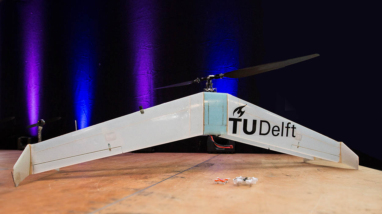 Een prototype van de Delftacopter. Deze drone van de TU Delft kan verticaal opstijgen, maar ook vliegen als een vliegtuig met snelheden tot wel 92 kilometer per uur.