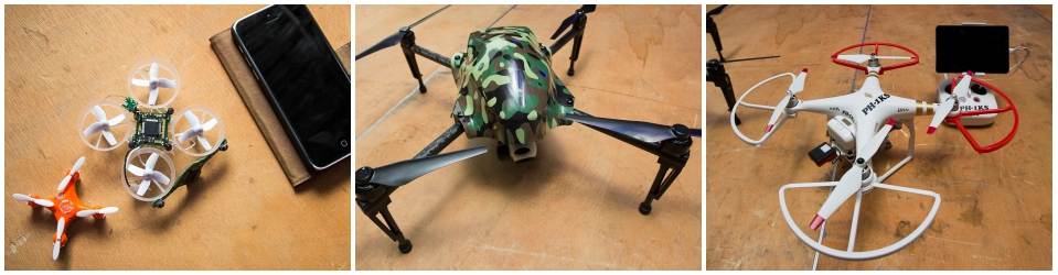Experimentele pocket-drones en meer gangbare commerciële systemen.