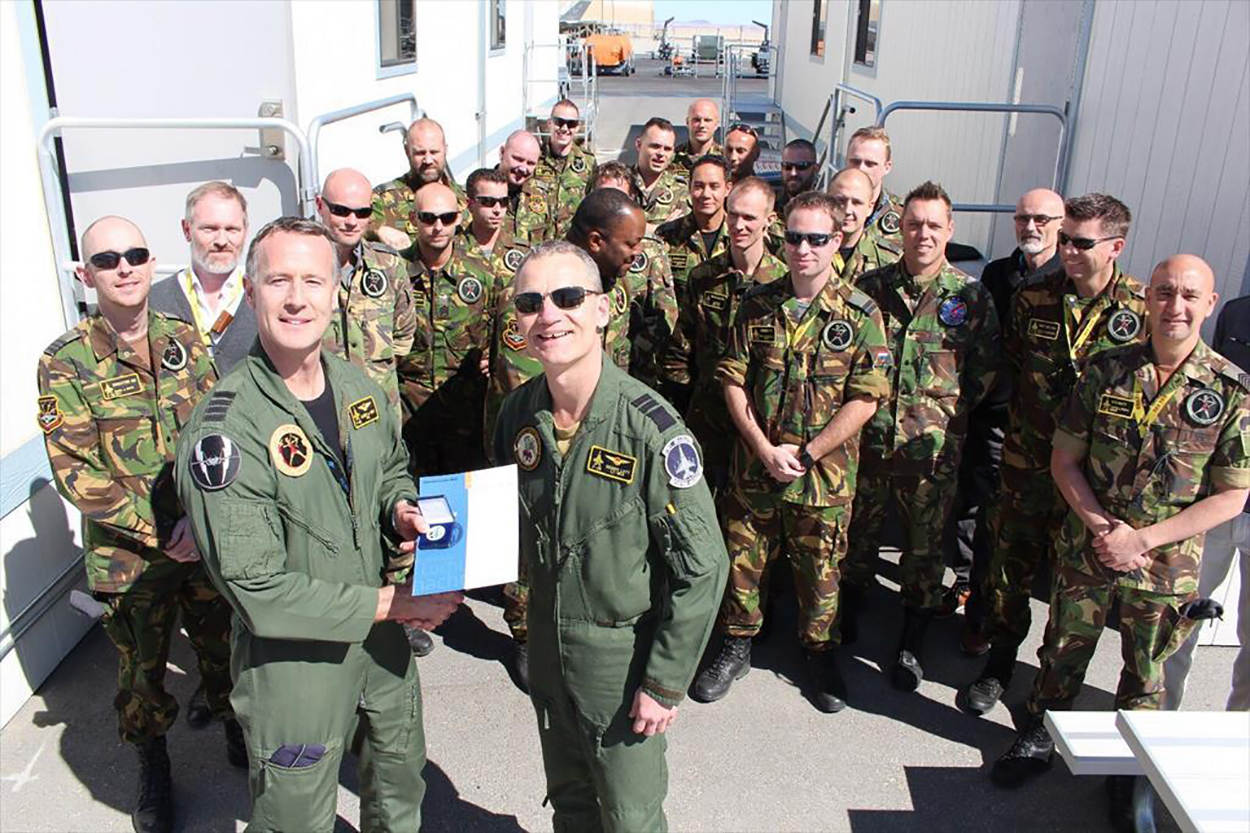 Op voordracht van 323’er sergeant-majoor Arjen Pietersma werd de coin aangevraagd en vervolgens uitgereikt door de C-LSK. Pietersma motiveerde dat zijn 42 collega’s al enkele jaren elke dag direct of indirect werken met technologische innovatie in de vorm van de F-35. Dit nieuwe wapenplatform brengt tal van technische en tactische veranderingen met zich mee en dat vraagt veel van de vliegers en al het ondersteunend personeel. De manier waarop alle squadronleden hier mee omgaan en zich effectief hebben georganiseerd en ingezet om het maximale uit de operationele test en evaluatie te halen voor een goede introductie van de F-35, verdient een Pionierscoin. Foto: KLu