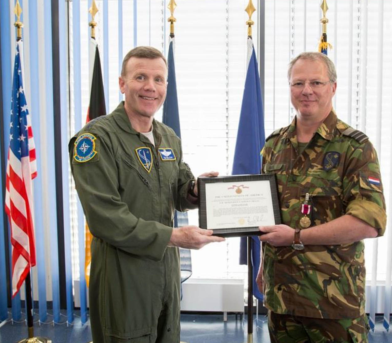 Samen met 30 deelnemers uit 13 verschillende landen namen sergeanten 1 Boaz Hardijzer (802 Squadron) en Johan Blom (130 Squadron) in maart en begin april deel aan de Inter European Air Force Academy. De focus van deze opleiding, verzorgd door US Air Force op Ramstein Airbase, ligt op leiderschap en het leren van verschillende culturen. Het zorgt voor verbreding voor de verdere ontwikkeling van luchtmachtonderofficieren. Foto: USAFE