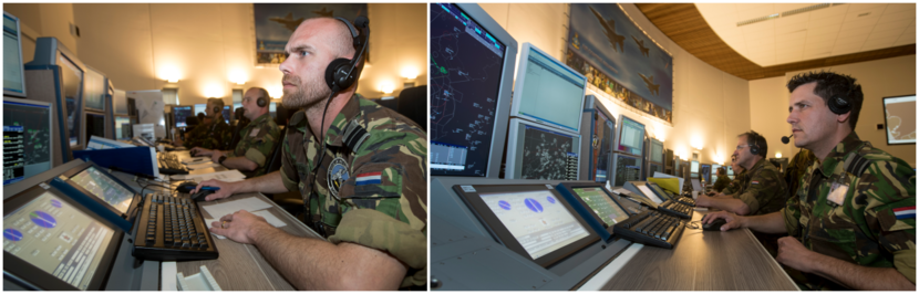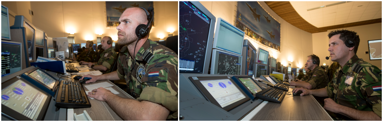 In de operations (ops) room van het Air Operations Control Station Nieuw Milligen (AOCS NM) zitten ze zij aan zij: de luchtverkeers- en gevechtsleiding. Achter de schermen, in dit geval dus letterlijk, heeft eerstgenoemde de handen vol aan het leiden van de ruim 40 toestellen naar en vooral van het oefengebied boven de Noordzee. “Druk? Vroeger waren we gewend aan veel vliegtuigen, tegenwoordig niet meer”, geeft supervisor majoor Rob de Vries aan. Daarom hebben we van tevoren flink getraind. Dit is voor ons leuk. Er gebeurt letterlijk veel achter de schermen. Frisian Flag-bloed stroomt hier bij iedereen door de aderen.”