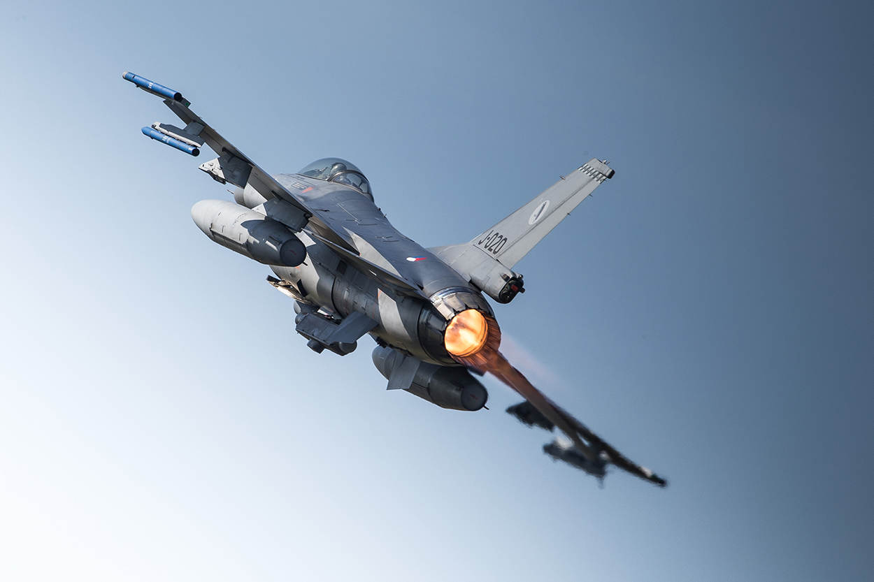 “Als we hier trainen, gebruiken we ervaring uit bijvoorbeeld Irak en Syrië”, gaat Remco verder. “Deze oefening geldt dus ook als voorbereiding voor hen die nog daar naartoe moeten.” Op de foto: Een Belgische F-16 begint aan zijn missie.