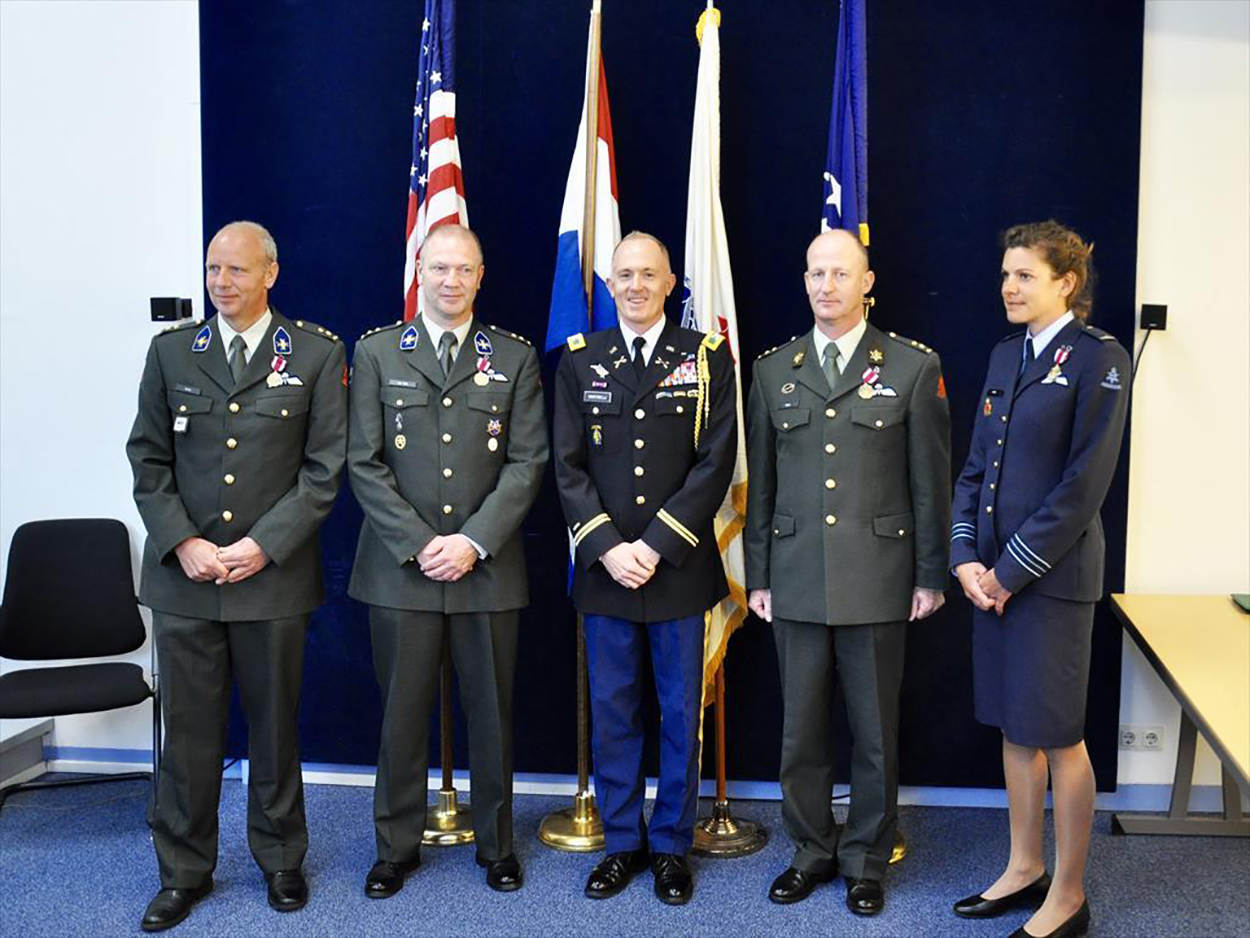 Het gaat om de overstes Marcel Wolfs, Albert van Dijk, Peter Floor en majoor Joyce Kivits. Zij maakten deel uit van de joint multinationale civiel diplomatieke missie van de United States Security Coordinator for Israel and the Palestinian Authority (USSC, meer hierover in de Vliegende Hollander 5 van 2016). Dat heeft als doel het Palestijnse veiligheidsapparaat te ondersteunen bij de professionele uitvoering van de taken in de Palestijnse gebieden. Het hoofd USSC luitenant-generaal Frederick S. Rudesheim kende de onderscheidingen toe. De Amerikaanse Defensieattaché kolonel Vincent Martinelli reikte ze uit. Foto: Defensie