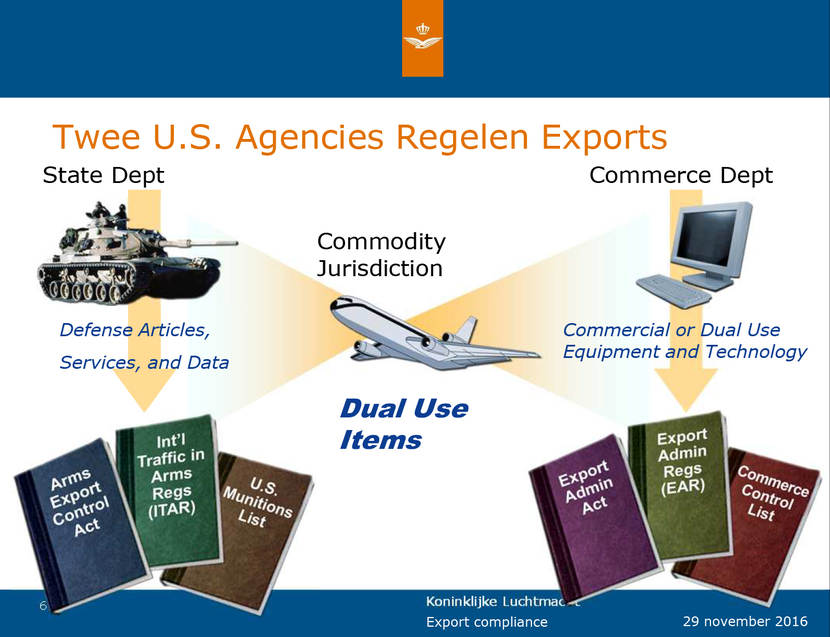 Waar gaat het over? Handel in wapens en allerhande specialistische militaire apparatuur is gebonden aan regels. Die stelt het land van herkomst op en voor Defensie is dat veelal Amerika. Al is het geleverd door een Nederlandse of Canadese firma, is het basismodel Amerikaans of zijn er onderdelen gebruikt uit Amerika, gelden hun exportregels. ‘Maar we hebben de vliegtuigen toch gekocht? Dan mogen we ermee doen wat we willen?’ “Die vraag horen we geregeld”, antwoordt luitenant-kolonel Erik Wijers, Hoofd Export Control Team CLSK. “Nou, nee dus. Helaas. Vergelijk het met een CD die je koopt; je mag de muziek draaien, maar alleen in eigen kring – niet voor publiek of de muziek bewerken. Met die voorwaarden ga je automatisch akkoord met de aankoop. Met wapens is het vergelijkbaar. Je tekent bij aanschaf de ‘End User Assurance’. Daarin staat onder andere ‘wij zullen niets overdragen aan derden, voor welk doel dan ook, tenzij we van tevoren toestemming aanvragen in Amerika. Dat geldt bijvoorbeeld ook voor reparaties.”
