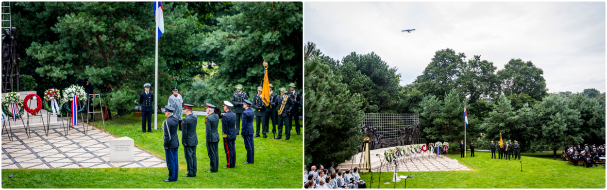 Commandant der Strijdkrachten generaal Tom Middendorp en Commandant Zeestrijdkrachten luitenant-generaal der mariniers Rob Verkerk plaatsen een krans namens de krijgsmacht. Voor de luchtmacht was onder andere generaal-majoor Mario Verbeek aanwezig. De plechtigheid begon zoals altijd met het intreden van het vaandel van 12 infanteriebataljon Luchtmobiel Regiment Van Heutsz en de aankomst van de minister-president. Aansluitend volgde het luiden van de Indische Klok. Er waren verschillende voordrachten en Wouter Hamel zong. De ceremonie eindigde met het overvliegen van de in 1941 gebouwde Catalina-vliegboot (die later die dag een geslaagde noodlanding maakte op vliegveld Lelystad) en een defilé langs het Indisch Monument dat bestaat uit 17 bronzen beelden, een kaart van Nederlands-Indië en de tekst ‘De geest overwint’. Foto’s: Valerie Kuypers