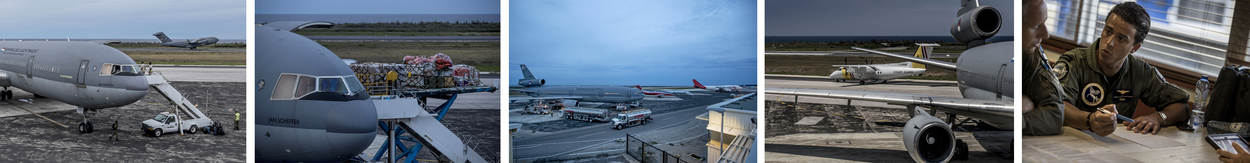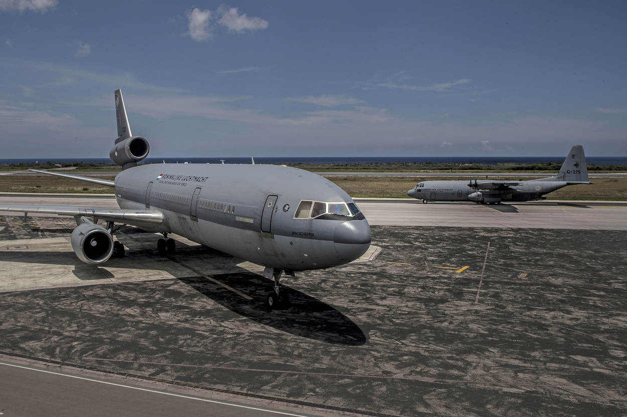 De avondzon spiegelt nog net in de glimmend zilveren tankauto’s van Curoil, de Curaçaose oliemaatschappij. Ze rijden af en aan op de platformen waar de KDC-10 van het 334 en 2 C-130’s van het 336 Squadron staan. Niet voor het eerst of laatst, want de – inmiddels – 2 Herculessen vliegen af en aan naar Sint-Maarten en de KDC-10 heen en terug naar Nederland.