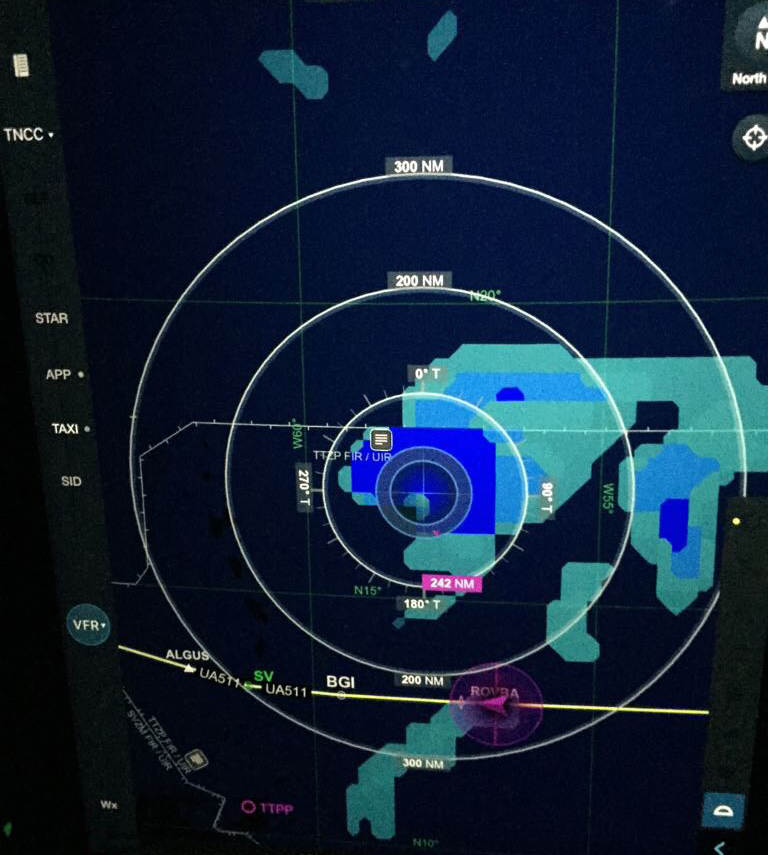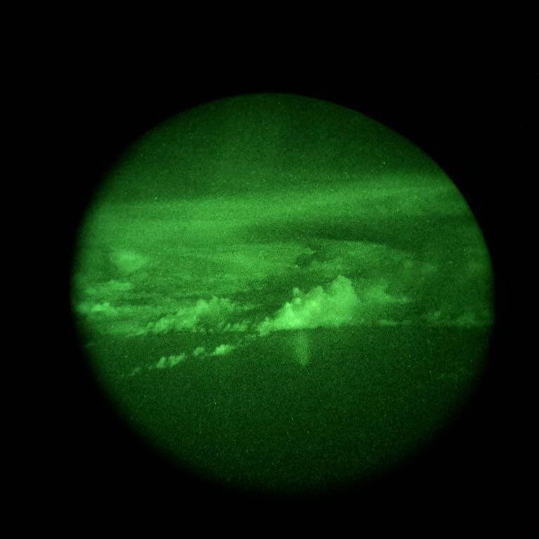“Zowel de KDC-10 als de C-130 nemen de standaard zuidelijke route naar Curaçao”, zegt ops-kapitein Rob, tevens copiloot op de KDC-10. “Op die manier ontwijken ze de 2e orkaan José die zich op de Atlantische Oceaan ontwikkelt. Ze hoeven dus niet om te vliegen.” De C-130 passeert het gevaarte 100 mijl ten oosten van Guadeloupe, op 200 mijl afstand. “José beweegt naar het noorden en wij naar het westen”, verduidelijkt Hercules-copiloot tweede luitenant Joost. “De weather briefing gaf aan dat we er geen last van zouden hebben en dat klopte. Het was een rustige vlucht en heel helder met een ¾ maan. Maar we hebben ‘m wel gezien op de radar en gezocht met onze NVG’s. En gevonden!”