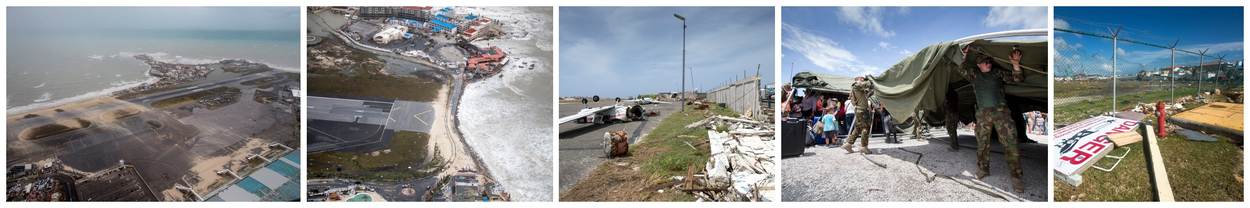 Twee keer per dag landt een Nederlandse Hercules op het internationale vliegveld van Sint-Maarten. De landingsbaan is inmiddels brandschoon, maar daarmee is ook alles gezegd. Vertrekhallen zijn zwaar beschadigd en worden nog niet gebruikt. Buiten wachten mensen uren in de snikhete zon op hun verlossende vlucht het eiland af. Sommige vakantiegangers en bewoners zijn zelf naar het vliegveld gelopen, anderen met bussen of door mariniers vervoerd. Marechaussee, mariniers en luchtmobiel leiden alles aan de rand van het vliegveld in goede banen, doen veiligheidscontroles en maken volgens de richtlijnen die ze hebben afwegingen wie wel en (nog) niet mee mag. Gewonden, ouderen, vrouwen, kinderen en baby’s eerst. Luchtmachters werken hard om alle hulpgoederen uit de vliegtuigen naar de opslag te brengen. Hier nemen militairen van de Luchtmobiele Brigade het over; zij helpen bij de distributie van de spullen.
