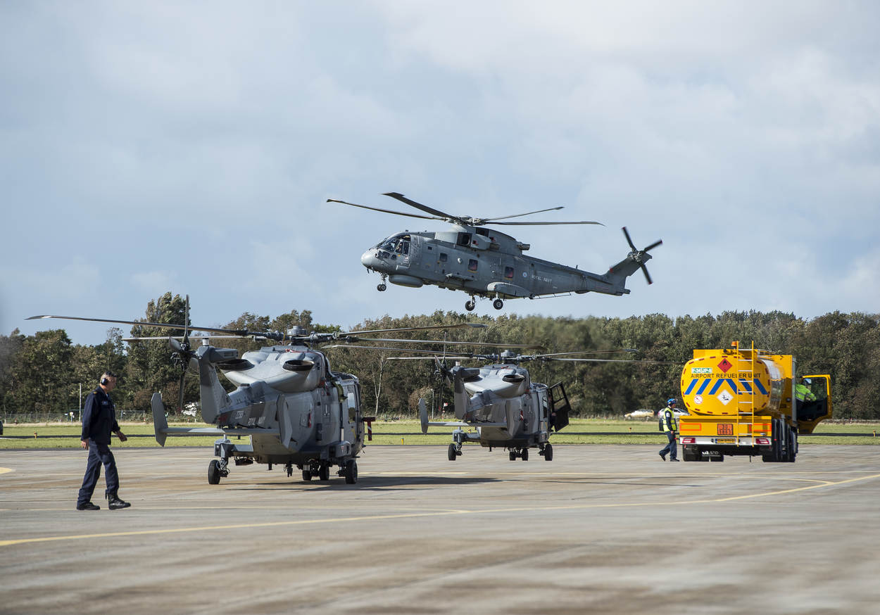 Een Britse Merlin landt terwijl de doorontwikkeling van de Lynx, de Wildcat, al op de grond staat.