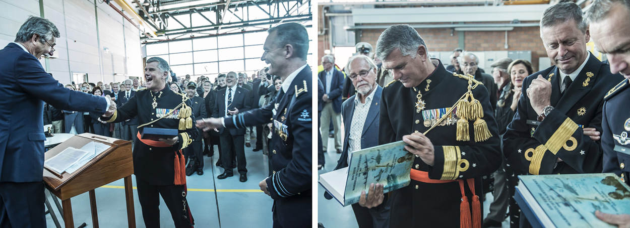 Op de foto’s (boven): ‘Helaas’ voor (inmiddels voormalig) C-ZSK luitenant-generaal der mariniers Rob Verkerk krijgt hij niet nr. 1 van het boek uitgereikt. “Dát is namelijk voor de koning”, zegt auteur commandeur bd Van Dijk. Met een brede lach neemt Verkerk nr. 2 in ontvangst. Nr. 3 is voor C-LSK, luitenant-generaal Dennis Luyt. Commandeur Polet (midden op foto r.) schreef 1 van de voorwoorden.