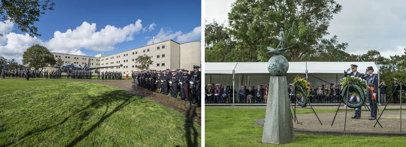 MLD-personeel flankeert tijdens de herdenkingsdienst een toestel uit het verleden, een SP-2H Neptune. Kransen werden onder anderen gelegd door de C-ZSK, veteranen en nabestaanden, en door C-LSK luitenant-generaal Dennis Luyt en zijn majoor-adjudant Linda Lauret.