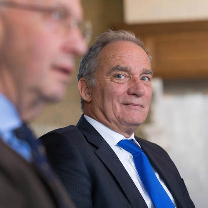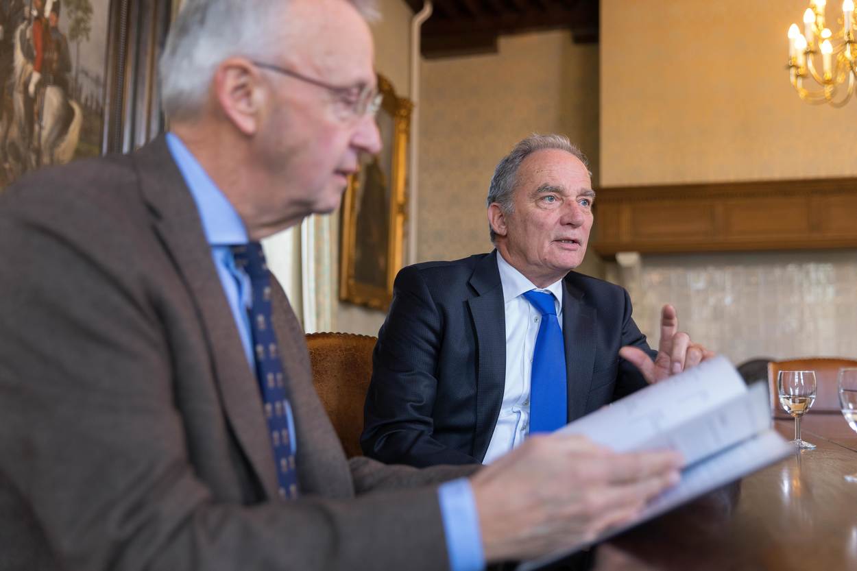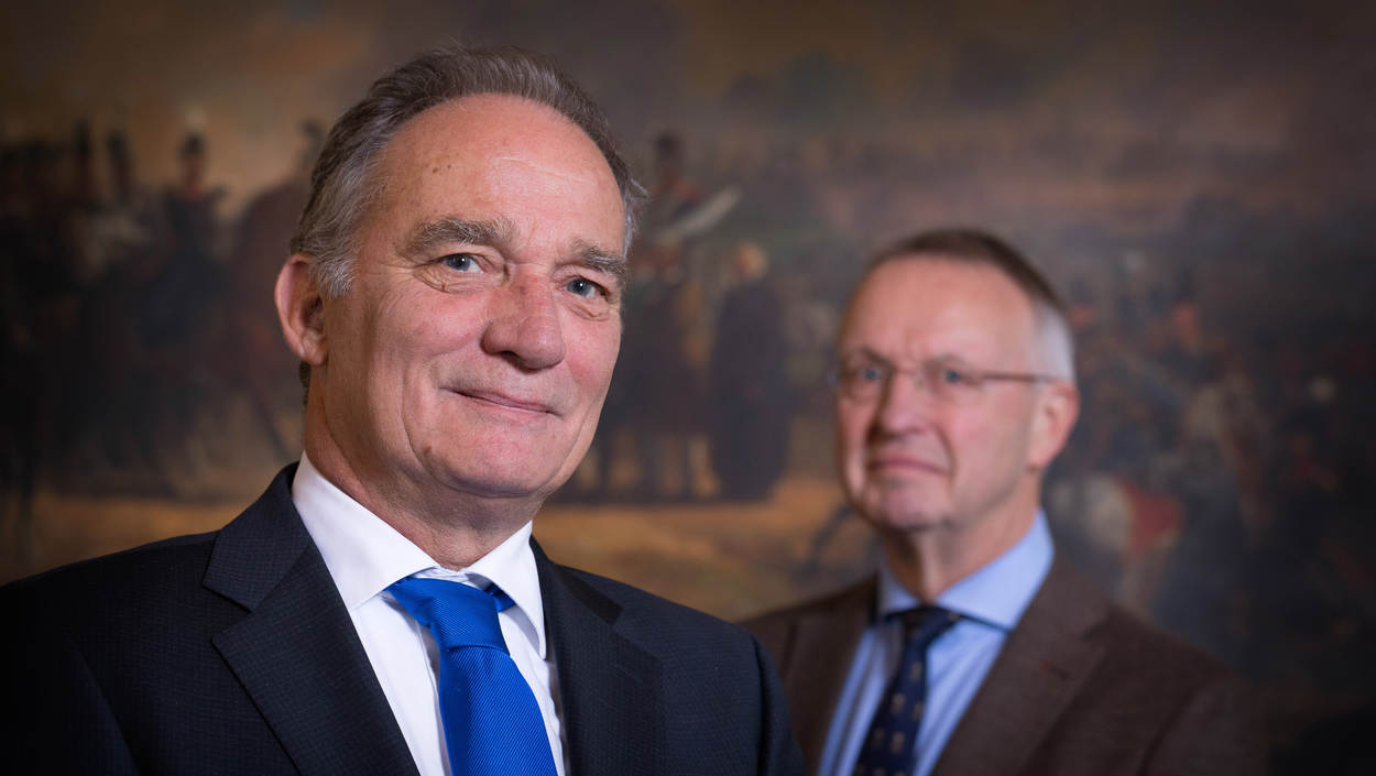 Voorzitter Jan van Hoof met op de achtergrond zijn voorganger Henny Melker.
