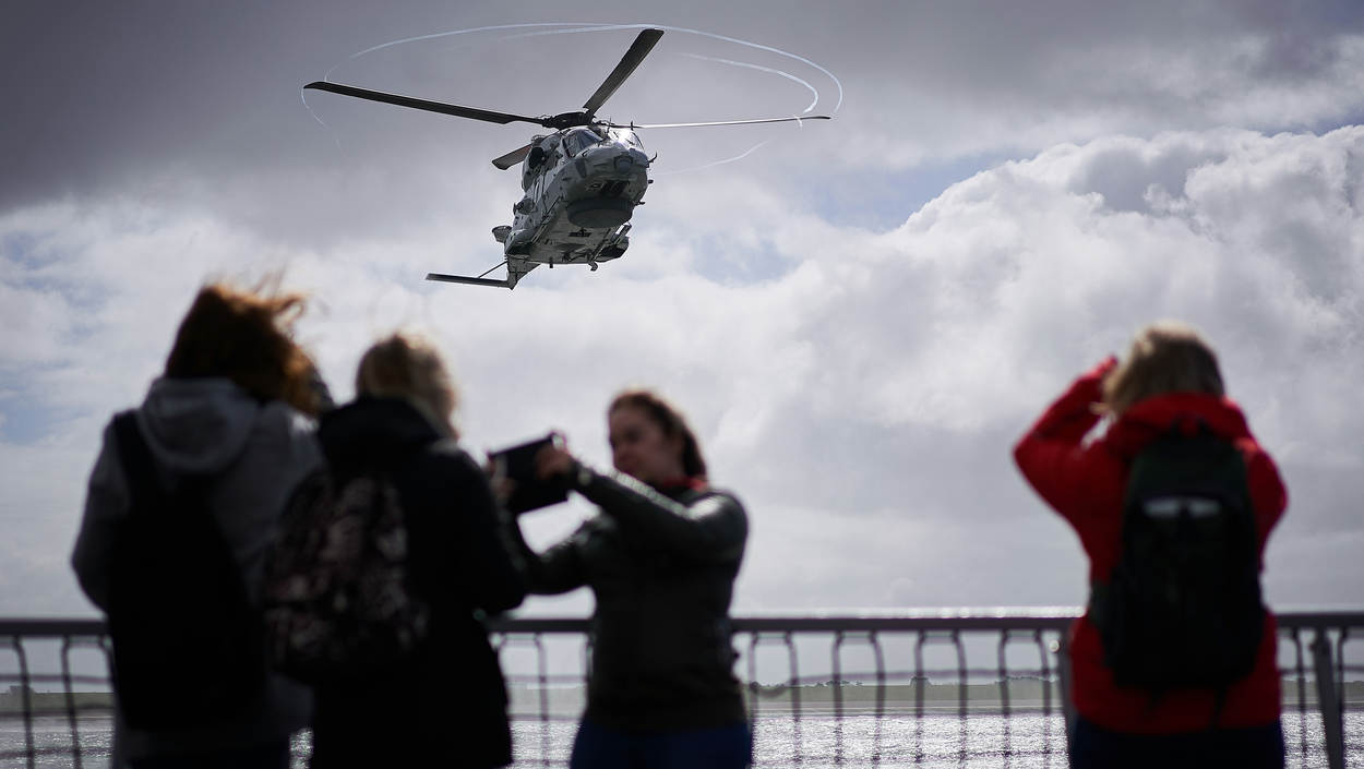 “Ik wil jachtvlieger worden; dat lijkt me het mooiste wat er is.” Als even later een NH90 langs het dek raast, kijkt ze haar ogen uit. Talloze smartphones worden getrokken om snel een selfie met de helikopter te kunnen nemen. De vlieger doet ondertussen zijn best de meisjes te imponeren. “Als ik op een heli terechtkom, is dat misschien toch niet zo erg”, deelt Kyra haar moeder mee na afloop. Los daarvan belooft een wervingsofficier van de luchtmacht Kyra in contact te brengen met een vrouwelijke F-16 vlieger. “Houd die droom vast, meisje, maar eerst je Havo-examen halen!”, zo drukt ze haar op het hart. Foto: Phil Nijhuis