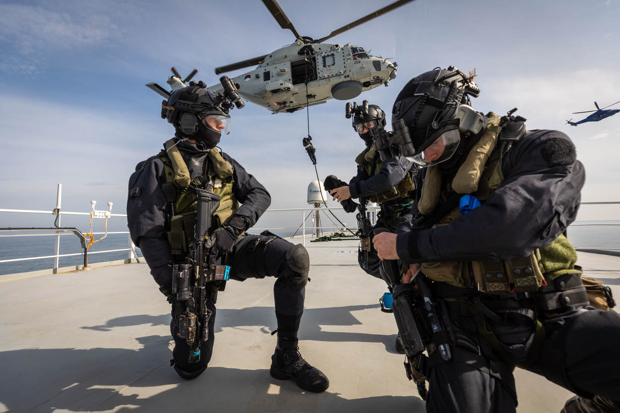 De Koninklijke Marine, politie, Kustwacht Nederland, gemeenten en havenbedrijven doorliepen een week lang verschillende scenario’s. Er werd geoefend op zee en in de havens van IJmuiden en Amsterdam. Voor ondersteuning vanuit de lucht was het 860 Squadron aanwezig met een NH90. Foto: Martijn Beekman