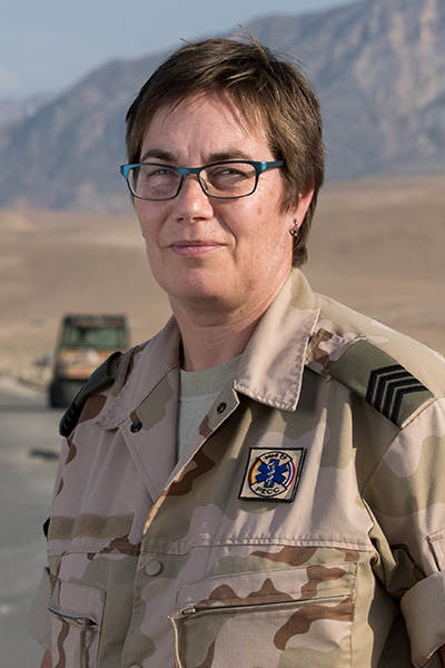 “Bij de PECC verzorg ik met collega’s al het patiëntentransport op Camp Marmal. Laatst hebben we 2 internationale collega’s laten overvliegen vanuit Kunduz met een CH-53. Zij zijn opgenomen in de role-2. 24 uur per dag monitoren we alle RS-militairen op Camp Marmal. Bij een incident reageren we zo snel mogelijk. Zo stond er binnen 5 minuten een ambulance op het kamp waar onlangs een collega onwel werd. Toch zijn er weinig spraakmakende incidenten. Buiten de poort is het oorlog, maar op het kamp is het rustig. Gelukkig maar natuurlijk, hoewel het mijn job wel saai maakt. In Gilze-Rijen ben ik als flightnurse altijd bezig. Ik sta graag met de handen aan het bed; hier zit ik achter een computer. Eigenlijk niets voor mij. Zeker in de nachtdienst is de werkdruk laag. Dan maak ik een praatje met collega’s uit Georgië, Montenegro, Hongarije, Armenië of België. Die internationale samenwerking vind ik hartstikke leuk. We leren over elkaars cultuur. Laatst kreeg ik uitleg over het Georgische alfabet; dat kwam zomaar ter sprake.