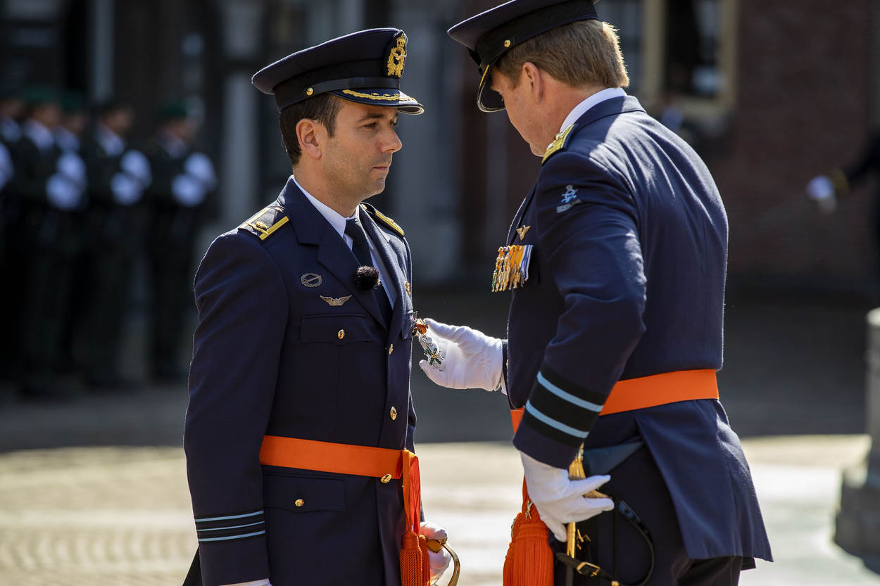 “Zo waarlijk helpe mij God almachtig.” De Ruiters eed galmt door de luidsprekers. Met een slag op de schouder van de koning mag De Ruiter zich ridder noemen en zich bij zijn voorgangers voegen. Het is een weerzien met zijn maat luitenant-kolonel Gijs Tuinman waarmee hij meerdere operaties in Afghanistan uitvoerde. De omhelzing is er duidelijk een van strijdmakkers met een gedeeld krijgsverleden. “Roy is een Gijs in de lucht. Een groter bewijs van respect is nauwelijks denkbaar”, memoreert de koning de uitspraak van een militair op de grond. Net als Tuinman is De Ruiter een tactisch creatieve militair. “Beleid wordt niet alleen op de basis gemaakt, maar ook in de cockpit terwijl de granaten langs suizen en de adrenaline – in de woorden van een vlieger – tegen de oogkassen klotst”, vervolgt de koning. “Om dan de rust en het overzicht te bewaren, moet je uitzonderlijke capaciteiten hebben. Majoor De Ruiter heeft bewezen daarover te beschikken.”