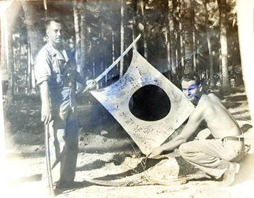 Rapmund na zijn expeditie met een op de Japanners buitgemaakte vlag.